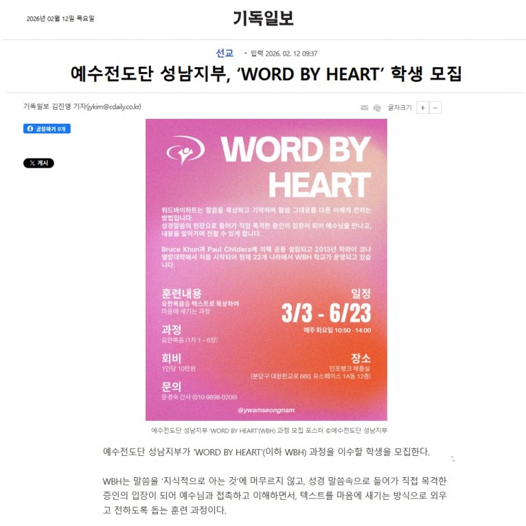 [기사] 예수전도단 성남지부, ‘WORD BY HEART’ 학생 모집(기독일보)