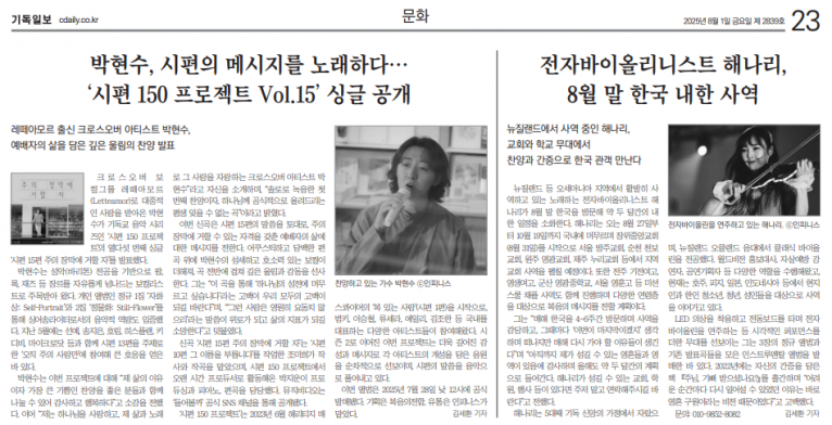 [기사] 노래하는 전자바이올리니스트 해나리, 8월 말 내한(기독일보)